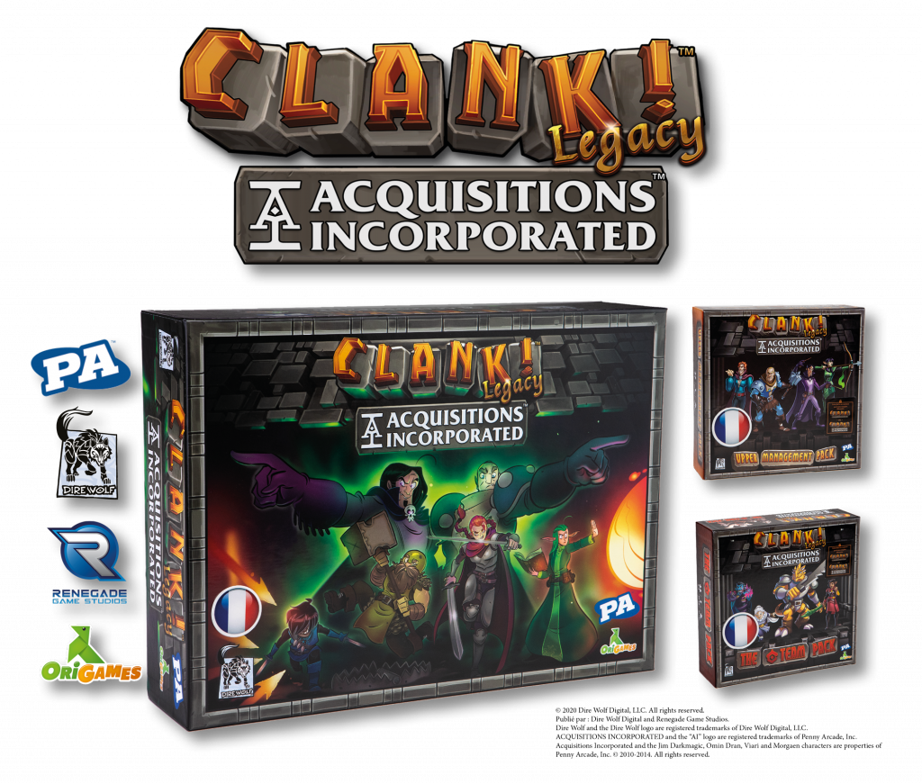 Le mercredi 14 avril 2021 à 20h, nous lançons la mise en vente du Clank! Legacy! Acquisitions Incorporated et des extensions Acquisitions Incorporated! en version française.