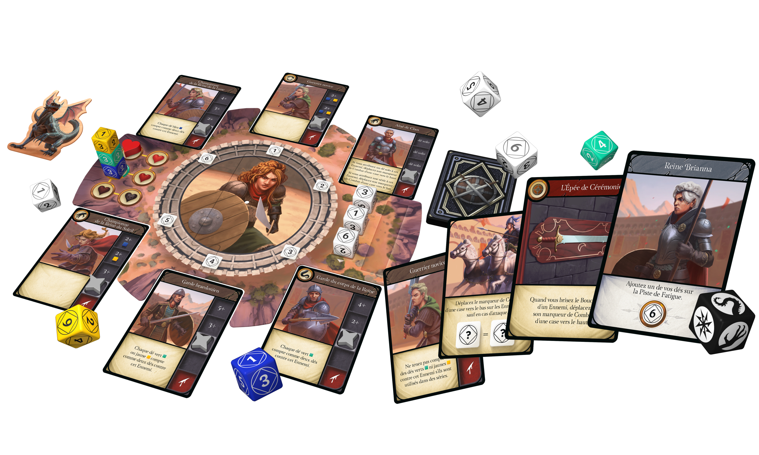 Vous incarnez Maia Coeur-Ardent. Votre objectif est de sortir victorieux de l’Arène du Grand Défi en battant 8 adversaires avant que vos points de vie ne soient réduits à zéro. À chaque manche vous n’avez qu’1 minute pour lancer et relancer vos séries de dés (mais pas les dés solos) afin d’obtenir les bonnes combinaisons et vaincre vos ennemis. Mais attention ! Vos ennenmis sont retors, et s’ils vous infligent le dégât fatal… recommencez l’aventure !